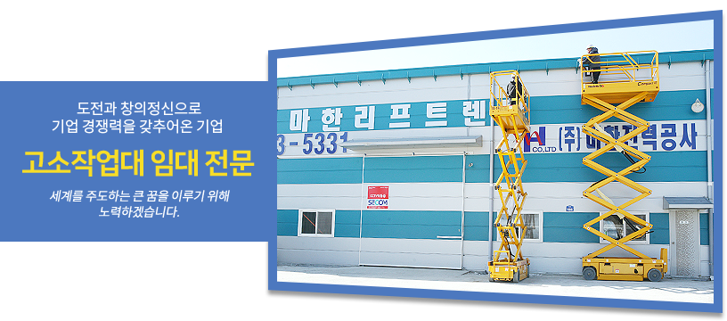 CATEGORY 주요공사실적 기술자보유현황 장비제원표 장비작동요령 임대가격표 (주)마한전력공사인사말 (주)마한리프트렌탈인사말 견적 및 상담신청 공지사항 고객센터Customer Center전화주시면 친절히상담해 드립니다. 익산점 063-833-5331 063-835-5331 전주점 063-223-5331 군산점 063-451-5331 H/P 010-8564-6321 FAX 063-835-5332 설치상담하러 가기 (1, 2인용, AC/DC)고소작업대임대 및 판매전문 CUSTOMER CENTER 익산점 063-833-5331 063-835-5331 전주점 063-223-5331 군산점 063-451-5331 H/P 010-8564-6321 FAX 063-835-5332 마한리프트렌탈 회사전경 회사 회사전경 사무실내부 사무실내부 마한리프트렌탈 장비사진 시노붐 GTJZ 1414 (16M) 지게차 3.3톤 미니 굴삭기 2톤 미니 굴삭기 1.7톤 마한리프트렌탈 옵션 경보등 및 경보음장치 미끄럼방지시트부착및발판스위치 아크릴 칸막이 상승시 주행차단 리미트